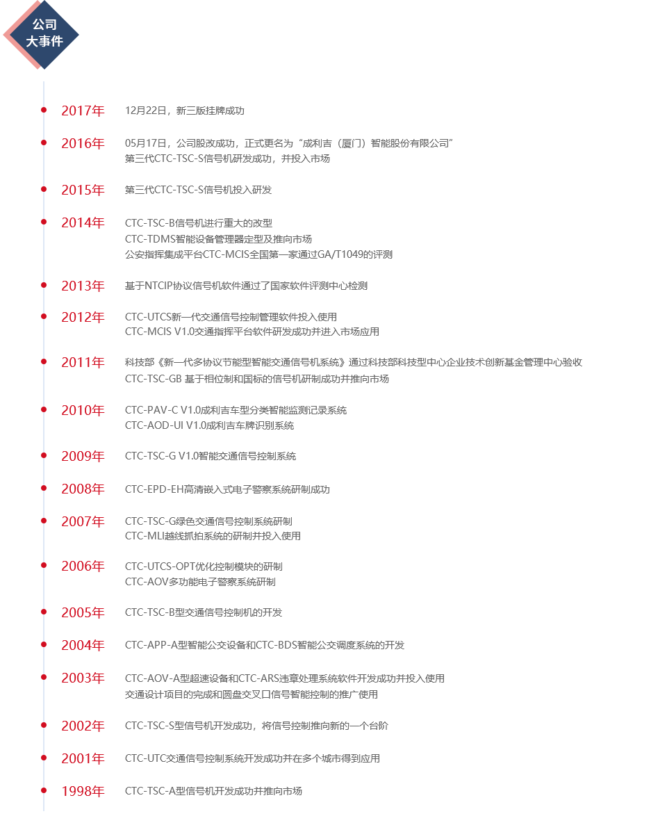 成利吉(廈門)智能股份有限公司,成立于1998年,是國內(nèi)最早從事智能交通領(lǐng)域產(chǎn)品研發(fā)和應用、專業(yè)智能交通核心軟件開發(fā)、智能交通系統(tǒng)集成與運營服務的企業(yè)之一。公司于2016年5月正式更名為成利吉(廈門)智能股份有限公司,并于2017年12月22日新三版成功掛牌。